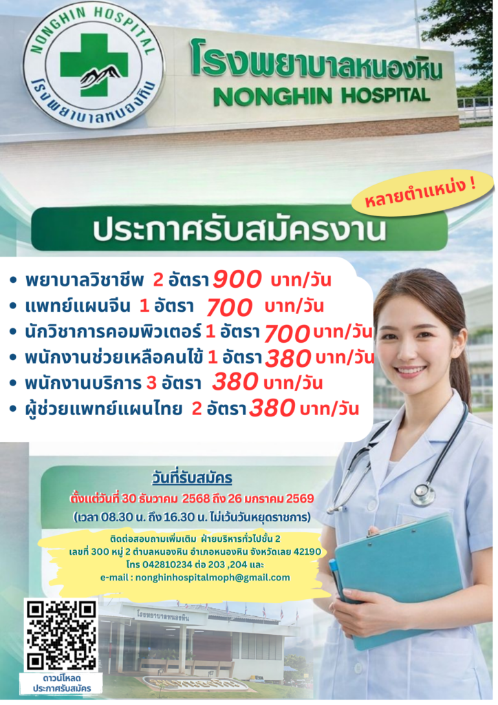 - เปิดรับสมัคร สอบคัดเลือกบุคคลเพื่อจ้างเป็นลูกจ้างชั่วคราว (รายวัน) ตำแหน่ง พยาบาลวิชาชีพงแพทย์แผนจีน,นักวิชาการคอมพิวเตอร์, พนักงานช่วยเหลือคนไข้,พนักงานบริการ,งผู้ช่วยแพทย์แผนไทย(ลงประกาศ 30 ธ.ค. 68)