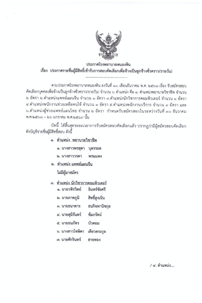 ประกาศรายชื่อผู้มีสิทธิ์สอบคัดเลือกบุคคลเพื่อจ้างเป็นลูกจ้างชั่วคราว (รายวัน) ตำแหน่ง พยาบาลวิชาชีพงแพทย์แผนจีน,นักวิชาการคอมพิวเตอร์, พนักงานช่วยเหลือคนไข้,พนักงานบริการ,งผู้ช่วยแพทย์แผนไทย(ลงประกาศ 27 ม.ค. 69)